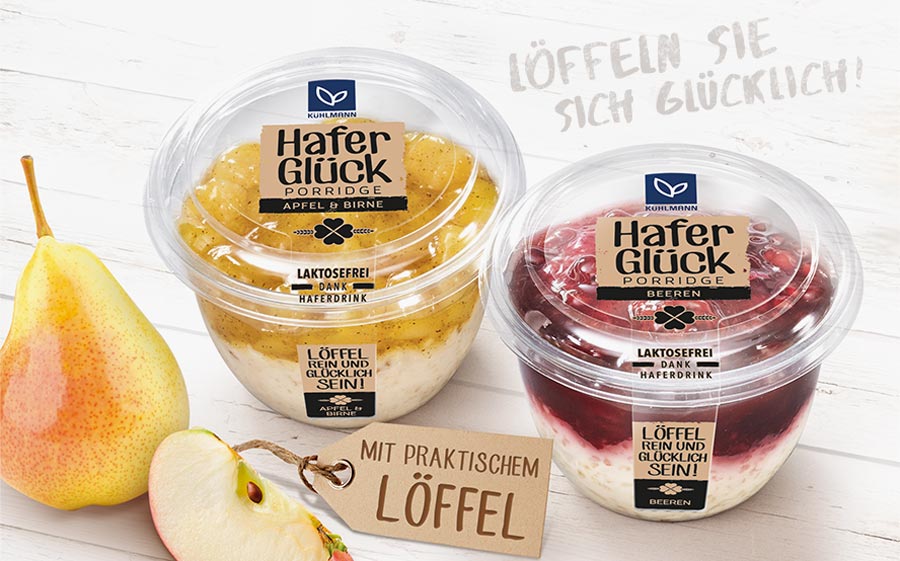 Probieren Sie unsere „Neuen“: Porridge auf Haferdrink-Basis mit den fruchtigen Toppings „Beere“ oder „Apfel und Birne“ – superlecker und gesund. Perfekt für ein schnelles Frühstück zu Hause, auf dem Weg ins Büro oder zur Uni. Nun auch löffelfertig für on-the-go – der perfekte Snack für zwischendurch.